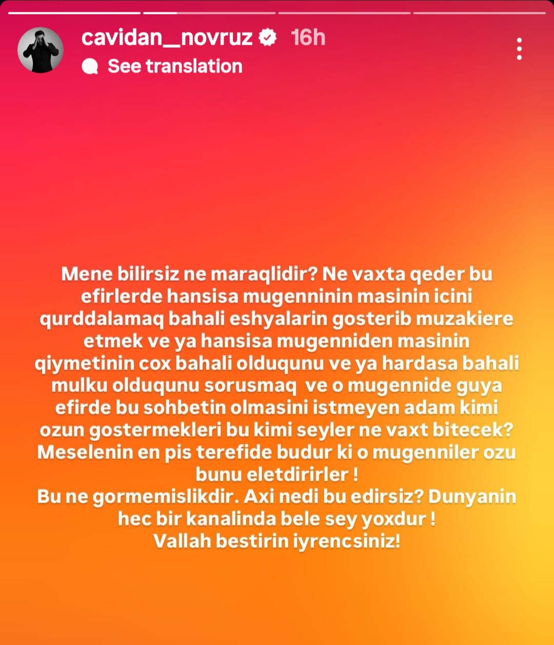 "Mənə bilirsiniz, nə maraqlıdır? Nə vaxta qədər efirlərdə hansısa müğənninin maşınının içini qurdalamaq, bahalı əşyalarını göstərib müzakirə etmək və ya ondan mülkünün qiymətini soruşmaq dəbdə olacaq? Bir də o müğənnilərin guya bu söhbətin efirdə olmasını istəmirmiş kimi davranmaları...