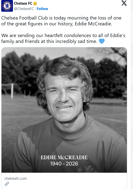 "Çelsi"nin keçmiş müdafiəçisi və baş məşqçisi, 1971-ci ildə UEFA Kuboklar Kubokunu qazanan Eddi Makkridi vəfat edib.