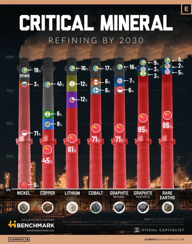 "Visual Capitalist" portalı yazır ki, Beynəlxalq Energetika Agentliyinin 2025-ci il hesabatına, mineral xammal məmulatı və nadir metallar üzrə ixtisaslaşan, o cümlədən dünya bazarı üzrə analitik kəşfiyyat şirkəti kimi tanınan "Benchmark Mineral Intelligence"in ekspert qrupunun məlumatlar bazasına əsaslanan infografikaya görə, Çin dövləti litium, nadir torpaq elementləri, kobalt və qrafit emalının təxminən 60 faizini tam nəzarətdə saxlayacaq.