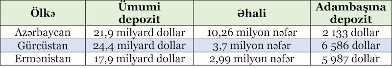 Rəqəmlərdən də göründüyü kimi, Gürcüstanla müqayisədə Azərbaycanda adambaşına düşən depozit məbləği 3,1 dəfə az olub.