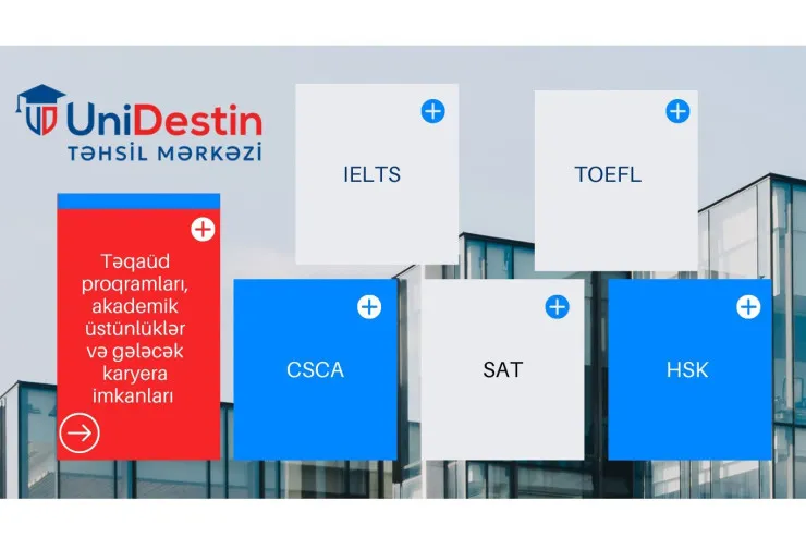 Bu ehtiyacı nəzərə alan UniDestin Təhsil Mərkəzi xaricdə oxumaq istəyən tələbələr üçün IELTS, TOEFL, SAT və HSK hazırlıq kurslarını universitet qəbul tələblərinə uyğun şəkildə təşkil edir. Dərslər yerli və xarici müəllimlər tərəfindən tədris olunur. Kurslar beynəlxalq imtahan formatına əsaslanır, tələbələrin mövcud səviyyəsinə uyğun fərdi və qrup dərsləri ilə həyata keçirilir.