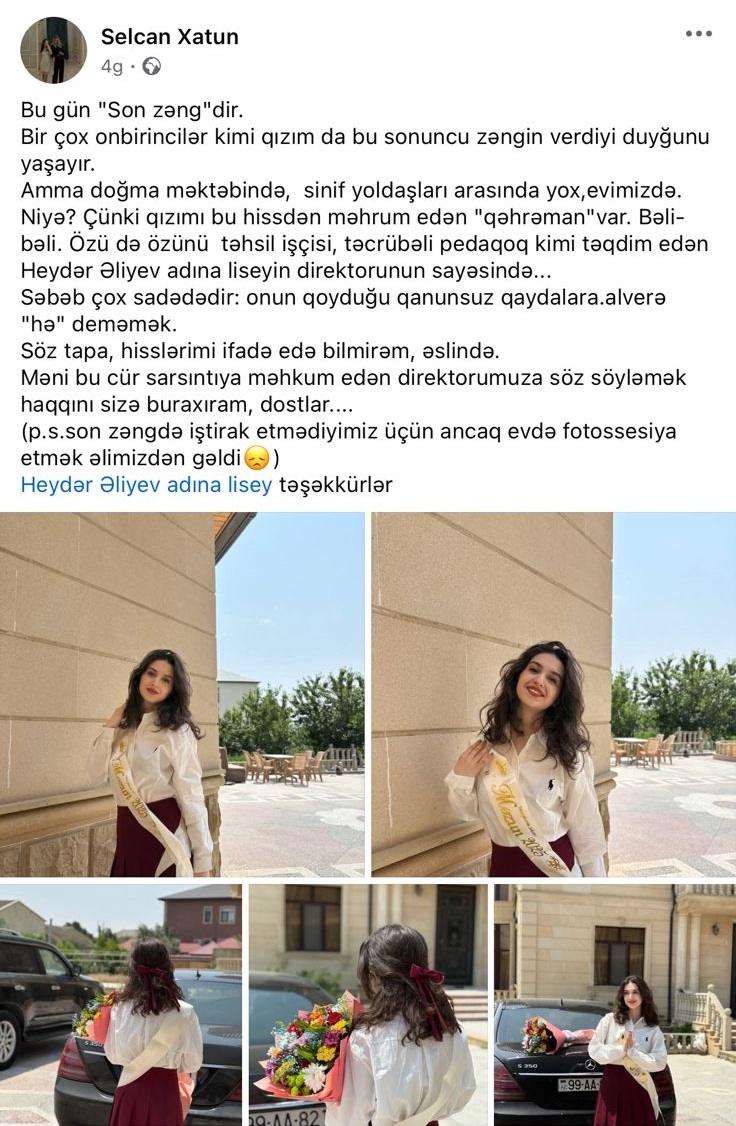 Bu, lisey direktorunun adının yer aldığı ilk qalmaqal deyil. S.Orucova həmçinin ötən il liseyin məzunlarından birini “Son zəng”ə gəlməsinə icazə verməyib. Bununla bağlı şagirdin anası paylaşım edib. O bildirmişdi ki, məktəbdən tədbir üçün tələb olunan 300 manatı maddi baxımdan ödəyə bilmədiyi üçün qızı direktor tərəfindən “Son zəng”ə buraxılamayıb.