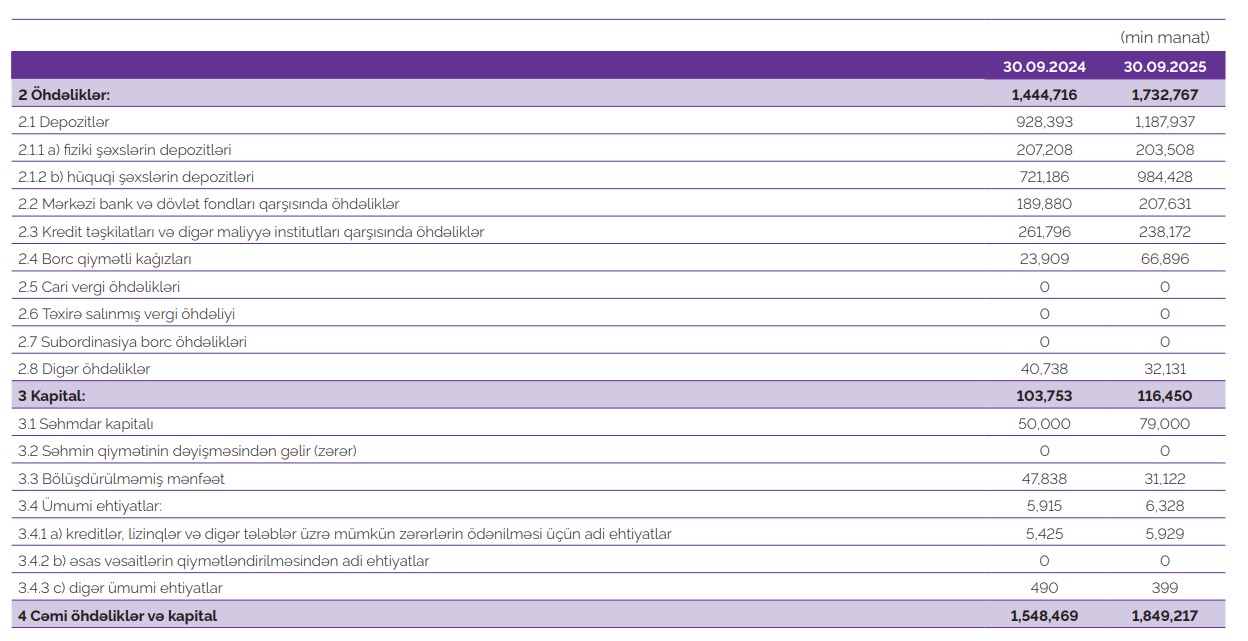 Bankın cəmi öhdəlikləri 30 sentyabr 2025-ci il tarixinə 1 milyard 732 milyon 767 min manat olub. Bu, ötən ilin eyni tarixindəki 1 milyard 444 milyon 716 min manata qarşı 288 milyon 51 min manat və ya 19,9% artım deməkdir.