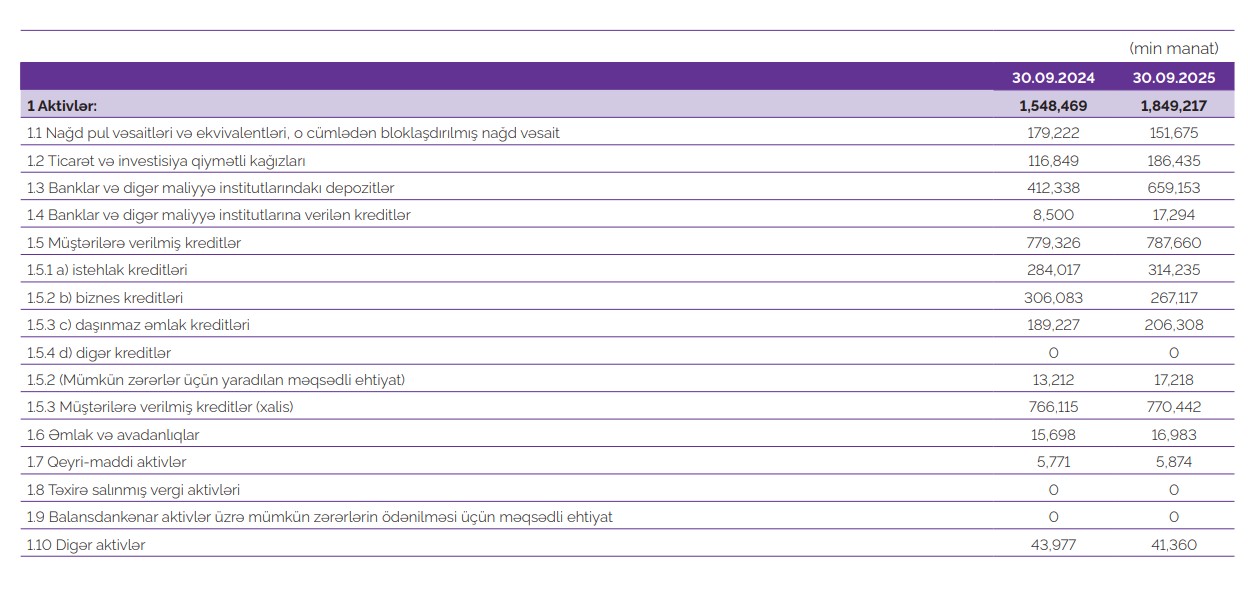 Fiziki şəxslərin depozitləri: 203 milyon 508 min manat (2024-cü ilin 30 sentyabr tarixindəki 207 milyon 208 min manatına qarşı) – 3 milyon 700 min manat və ya 1,8% azalıb.