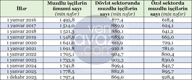 Müqayisə üçün bildirək ki, ötən ilin əvvəlində muzdla çalışan işçilərin sayı 1 milyon 778,5 min nəfər olub və onlardan 882,8 min nəfəri dövlət sektorunda, 895,7 min nəfəri isə qeyri-dövlət sektorunda çalışıb.