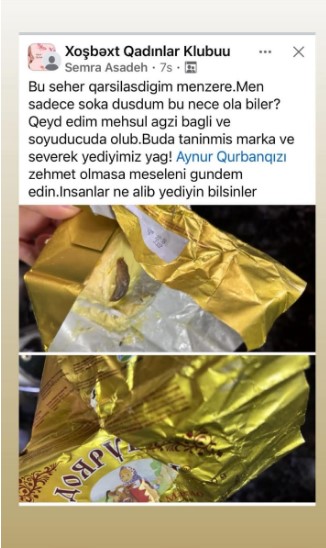 Tribun-nın məlumatına görə, bu barədə sosial şəbəkədə Səmra adlı xanım yazıb. Foto da paylaşan şikayətçi bildirib ki, yağ ağzı bağlı formada soyuducuda olub:
