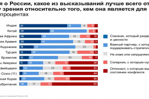 "Cebheinfo.az" xəbər verir ki, sorğuya görə Çin və Hindistan kimi ölkələr Rusiyanı strateji müttəfiq kimi görür. Qərb ölkələrinin əksəriyyəti isə onu rəqib və ya düşmən kimi dəyərləndirir.
