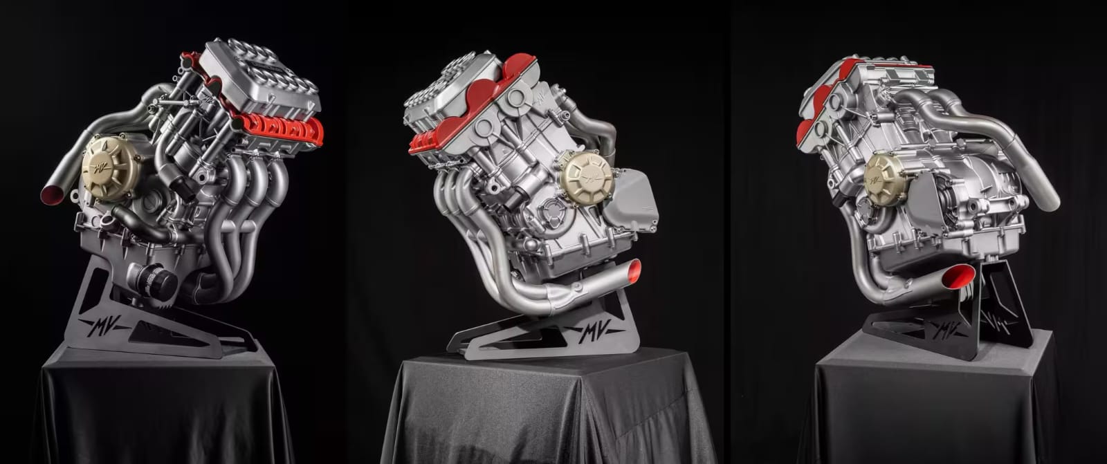MV Augusta şirkətinin hazırladığı mühərrikdə yuxarıda 2, aşağıda 3 silindr yer alır. 1 litrə yaxın həcmi olan mühərrik 240 at gücü hasil edə bilir. 2 dirsəkli valın olduği aqreqatda dövrlər sayı 16 minə çıxır.