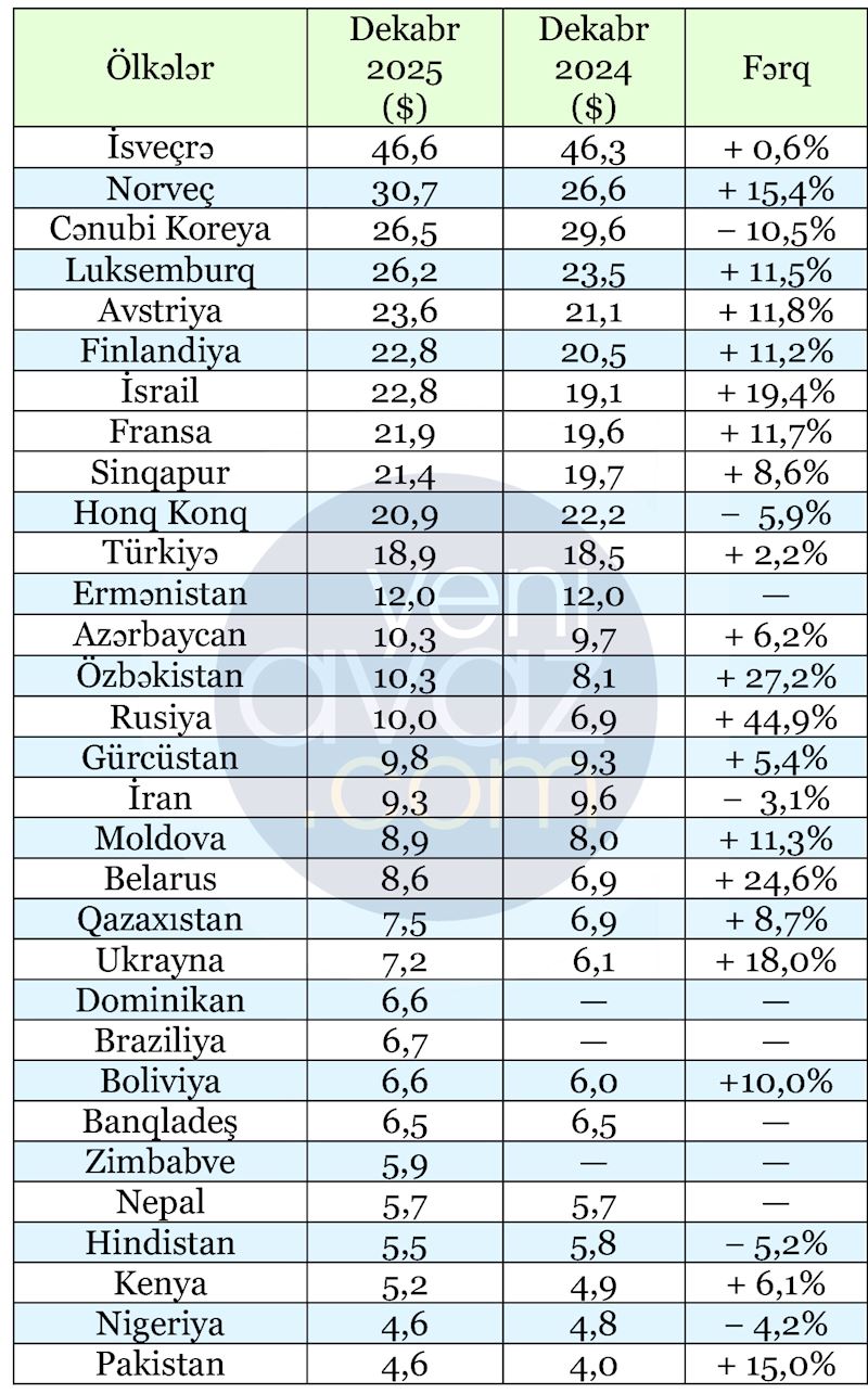 2024 və 2025-ci ilin dekabr aylarında dünyada mal ətinin ən baha və ən ucuz satıldığı 10 ölkə, həmçinin region ölkələrində mal ətinin 1 kiloqramının orta satış qiyməti aşağıdakı kimi olub: