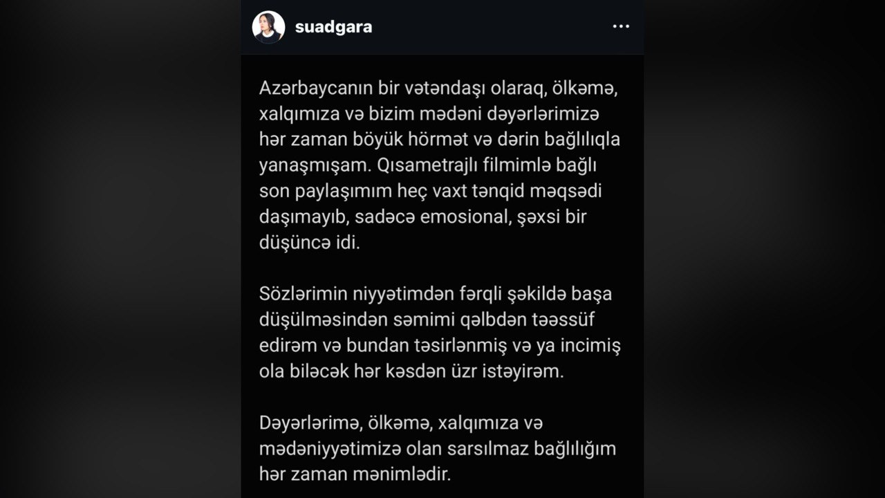 “Qısametrajlı filmimlə bağlı son paylaşımım heç vaxt tənqid məqsədi daşımayıb, sadəcə emosional, şəxsi bir düşüncə idi”.