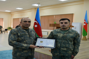 Sonra məzunlara sertifikatlar təqdim olunub, kurs birincisi leytenant Rahidə Şahverdiyeva tərəfindən yaş kötüyünə rəmzi emblem vurulub.