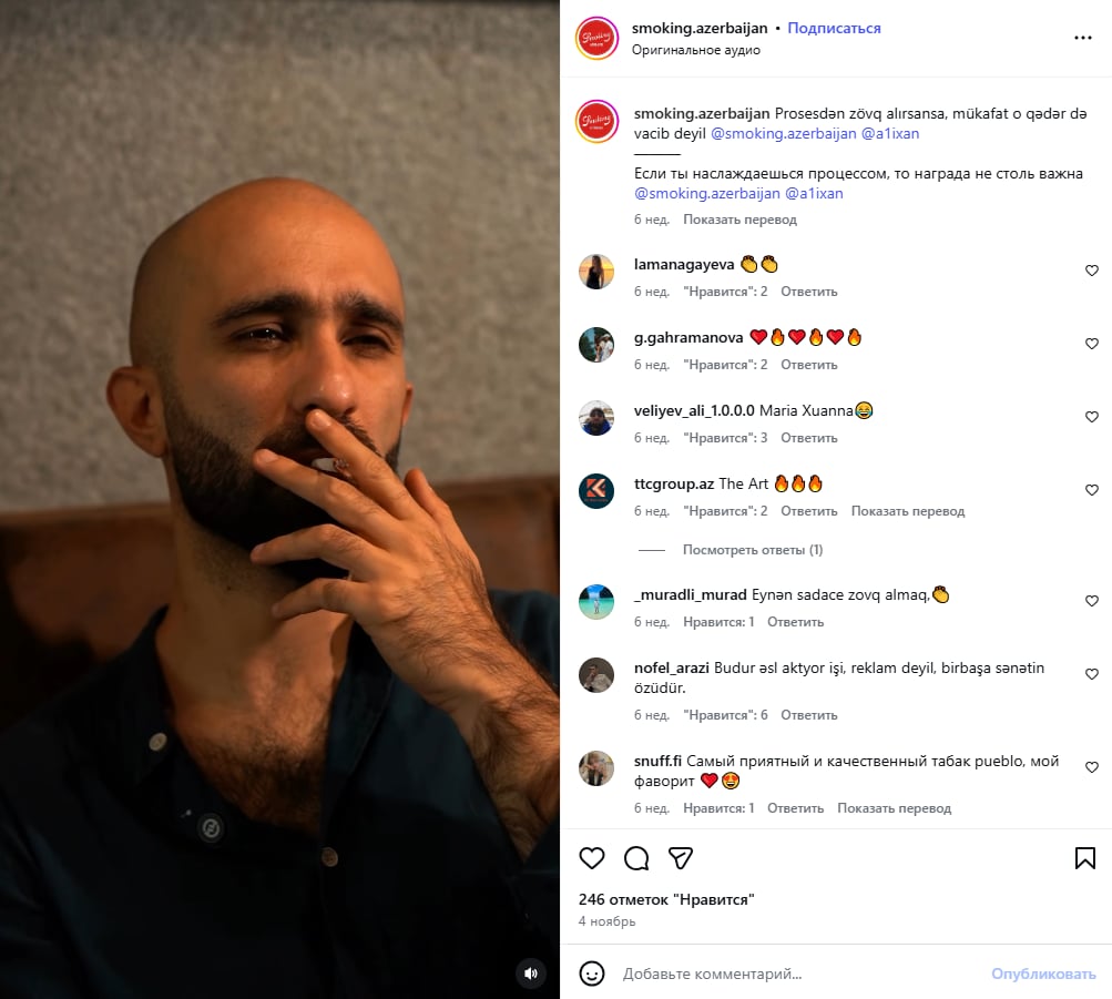 Apardığımız araşdırmaya görə, "Smoking Azerbaijan" səhifəsində tütün məhsullarının reklamına məhşur bloger və aktyorlar da cəlb edilir. 1000 manatlıq cəriməyə isə bloger və aktyor Əlixan Rəcəbovun son reklam çarxı səbəb olub.