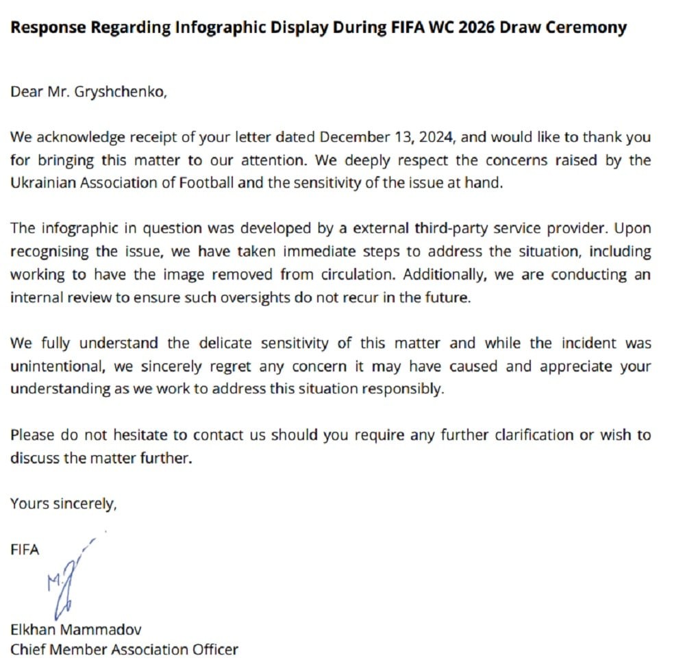 FİFA-nın şikayətçi tərəfə məktubu qurumun üzv assosiasiyalarla əlaqələr üzrə baş direktoru, AFFA-nın sabiq baş katibi və icraçı vitse-prezidenti Elxan Məmmədovun imzası ilə göndərilib. Sənəddə yanlışlığın haradan qaynaqlandığı əksini tapıb: “Bu infoqrafik xəritə üçüncü tərəf olan xarici xidmət provayderi tərəfindən hazırlanıb. Bu problem üzə çıxdıqdan dərhal sonra vəziyyəti düzəltmək, şəklin dövriyyədən çıxması üçün lazım olan addımlar atdıq. Gələcəkdə belə səhvlərin bir daha baş verməməsi üçün təhlillər aparırıq. Belə məsələnin həssaslığını bilirik və hadisənin bilərəkdən baş verməməsinə baxmayaraq, vura biləcəyi mənəvi zərərə görə səmimi qəlbdən təəssüflənirik".