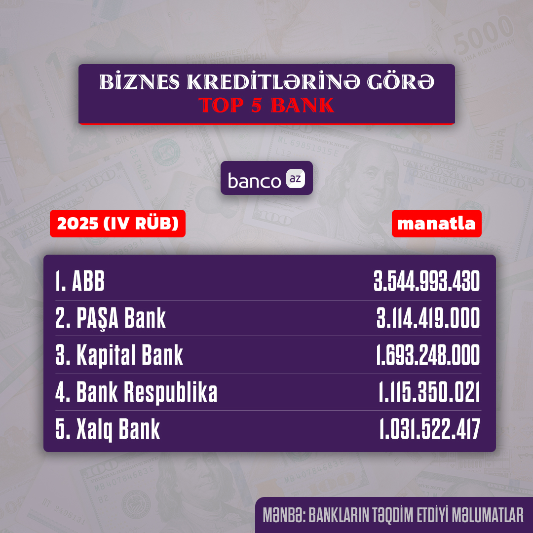 Azərbaycan banklarının 2025-ci ilə olan göstəricilərinə əsasən, 5 bankın biznes kreditləri portfeli milyardı ötüb. Belə ki, ABB-nin biznes kreditlərinin həcmi 3,5 milyard manat, PAŞA Bank-ın biznes kreditlərinin həcmi isə 3,1 milyard manat təşkil edib.
