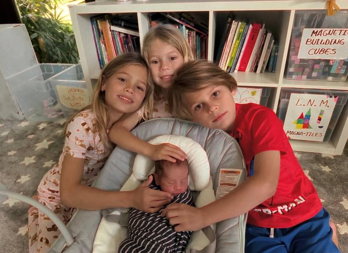 Uşaqlar kameraya poz verərək ailənin yeni üzvünü qucaqlayırlar.
