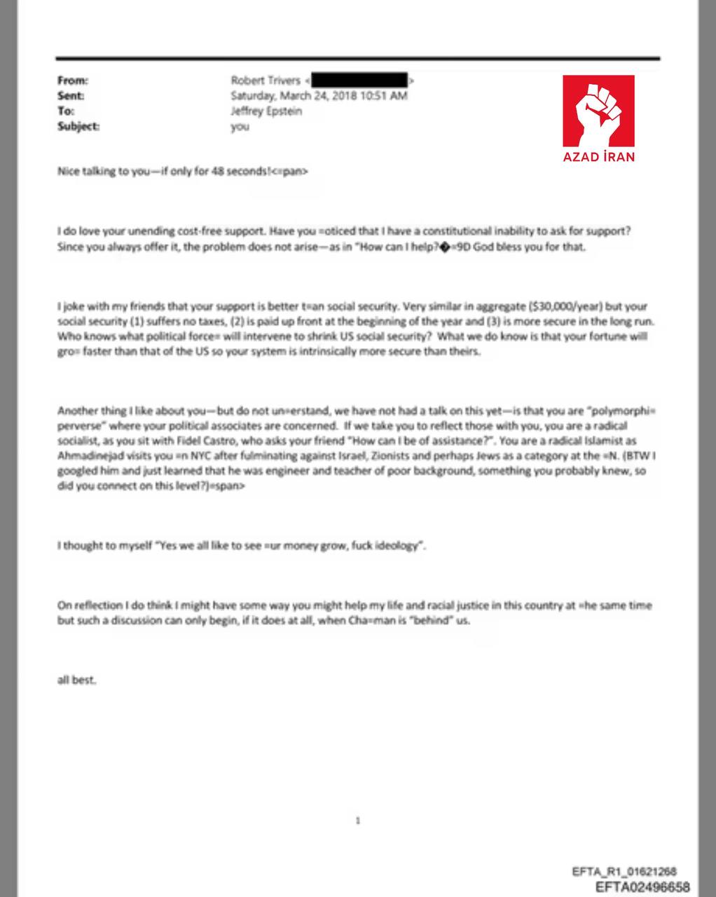 Eyni yazışmada Mahmud Əhmədinejadla bağlı məqam da səsləndirilir. Trivers qeyd edir ki, Əhmədinejad İsraili və bəlkə də ümumilikdə yəhudiləri tənqid etdikdən sonra 2018-ci il martın 24-də Nyu-Yorkda Epşteynlə görüşüb. O, habelə, “Google”da apardığı axtarış nəticəsində Əhmədinejadın mühəndis və müəllim olduğunu öyrəndiyini və Epşteynin niyə onunla əlaqə saxladığını anlamadığını yazır.