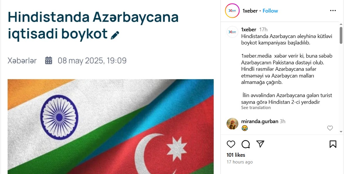 Eyni zamanda, sosial mediada Hindistandan Azərbaycan və Türkiyəyə turist kimi səfər edən bu ölkə vətəndaşlarına səfərləri birdəfəlik ləğv etmək və bu ölkələri “boykot” çağırışları yayılır.