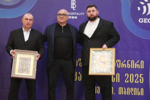 AAF rəsmisi Gürcüstan Ağırlıqqaldırma Federasiyasının prezidenti Laşa Talaxadze və 3 qat Olimpiya çempionu Kaxi Kaxiaşviliyə federasiyamız adından xatirə hədiyyələrini təqdim edib.