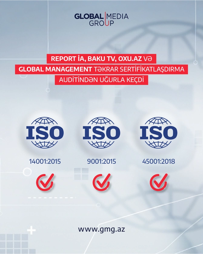 Qeyd edək ki, "Global Media Group"un tərkibində fəaliyyət göstərən "Baku TV", "Oxu.az", "Report" İnformasiya Agentliyi və "Global Management" şirkətləri 2022-ci ildən etibarən sözügedən beynəlxalq ISO standartları üzrə sertifikatlara malikdir.