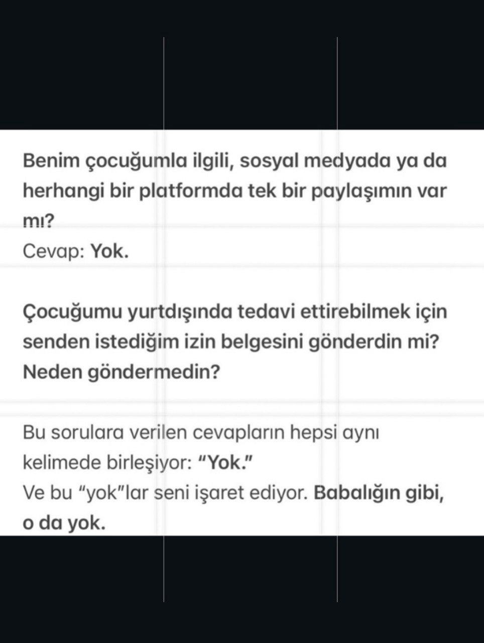 Cavab: Heç etməmisən. Uşağımla bağlı sosial mediada və ya hər hansısa platformada bir paylaşımın olubmu? Cavab: Olmayıb. Övladımı xaricdə müalicə etdirmək üçün səndən istədiyim icazə sənədini göndərdinmi? Niyə göndərmədin? Bu sualların hamısının cavabı eyni sözlə yekunlaşır: “Yox.” Və bu “yox”lar səni göstərir. Atalığın kimi, o da yoxdu.