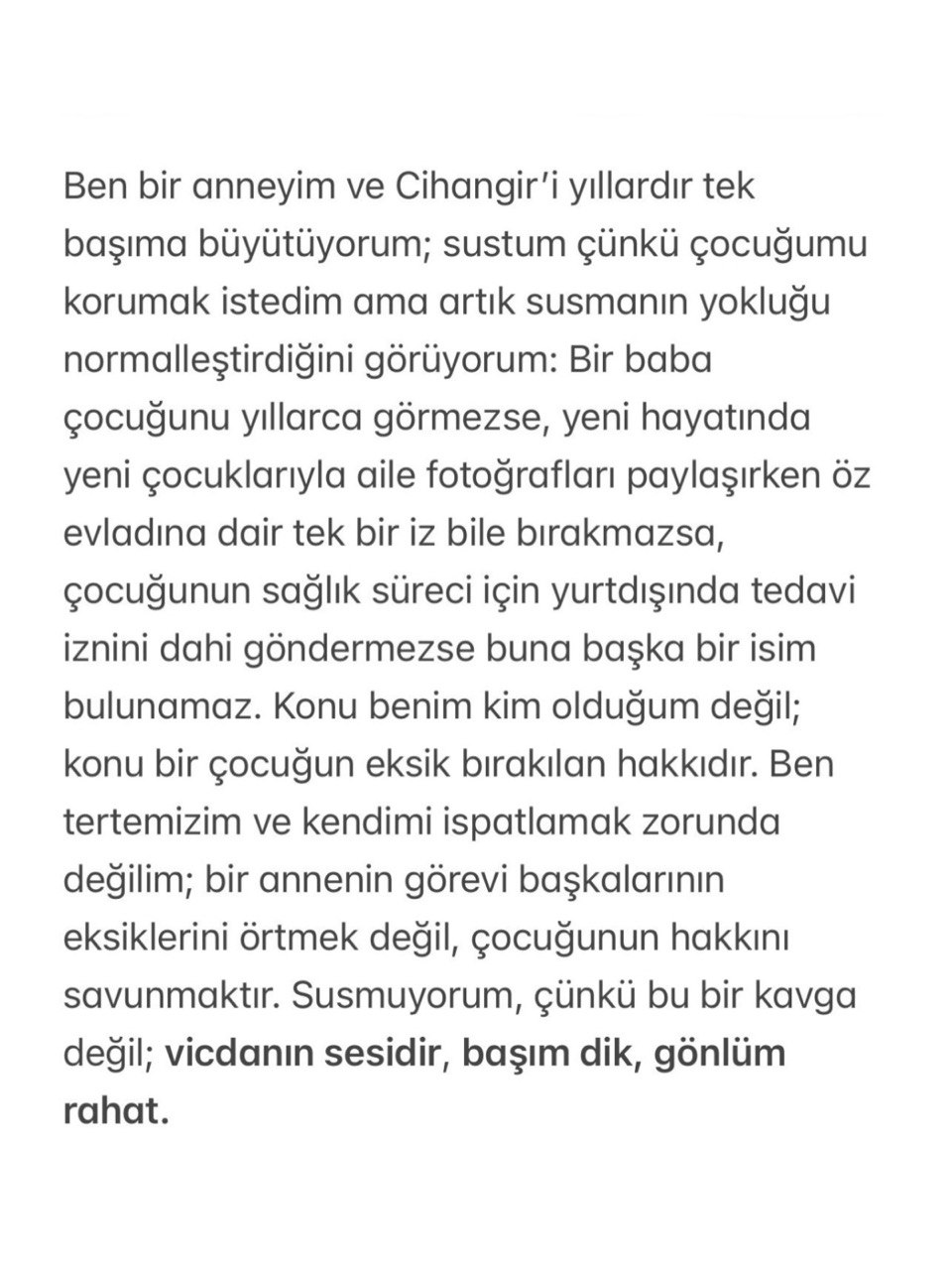 “Mən bir anayam və Cihangiri illərdir təkbaşına böyüdürəm. Susdum, çünki övladımı qorumaq istədim. Amma artıq görürəm ki, susmaq yoxluğu adi hala çevirir.