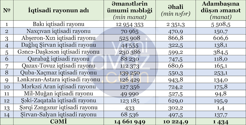 Azərbaycanın iqtisadi rayonlarında əhalinin sayı, banklardakı əmanətləri və adambaşına düşən əmanət məbləği aşağıdakı kimi olub: