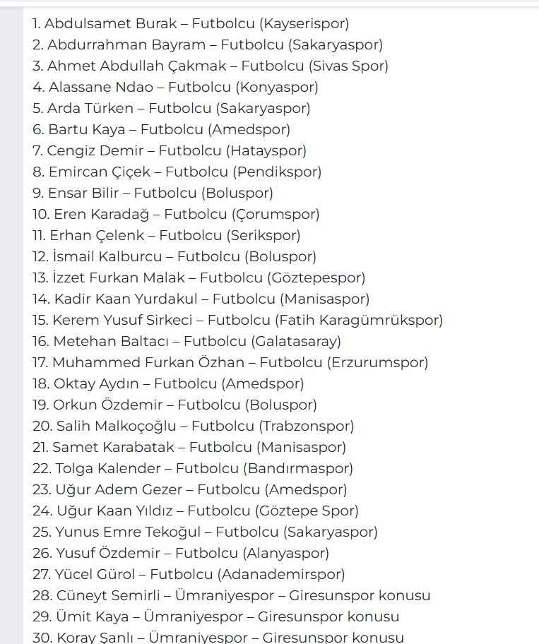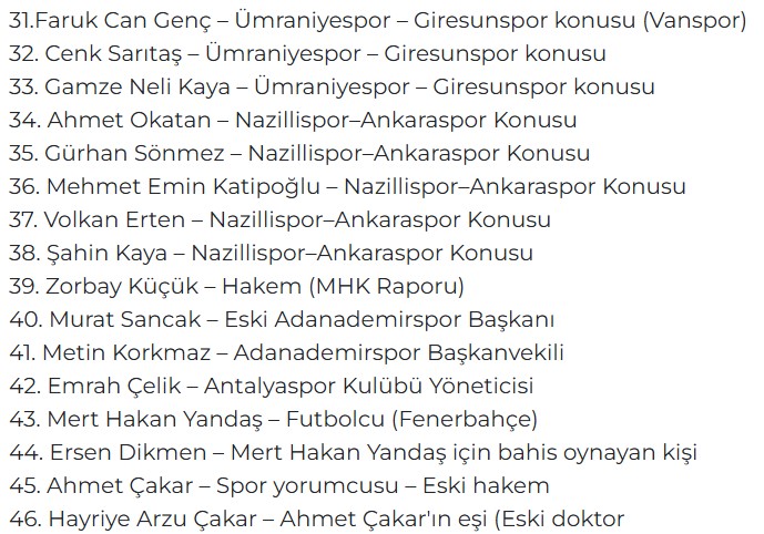Türkiyədə mərc oyunları ilə bağlı gedən istintaq araşdırması zamanı haqqında saxlanılma qərarı çıxarılan 46 nəfərin adı açıqlanıb.