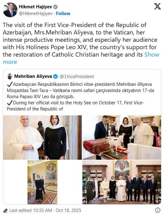 Azərbaycan Prezidentinin köməkçisi – Azərbaycan Prezidentinin Administrasiyasının Xarici siyasət məsələləri şöbəsinin müdiri, Hikmət Hacıyev ölkənin Birinci vitse-prezidenti Mehriban Əliyevanın Vatikan səfəri barədə "X" hesabında paylaşım edib.