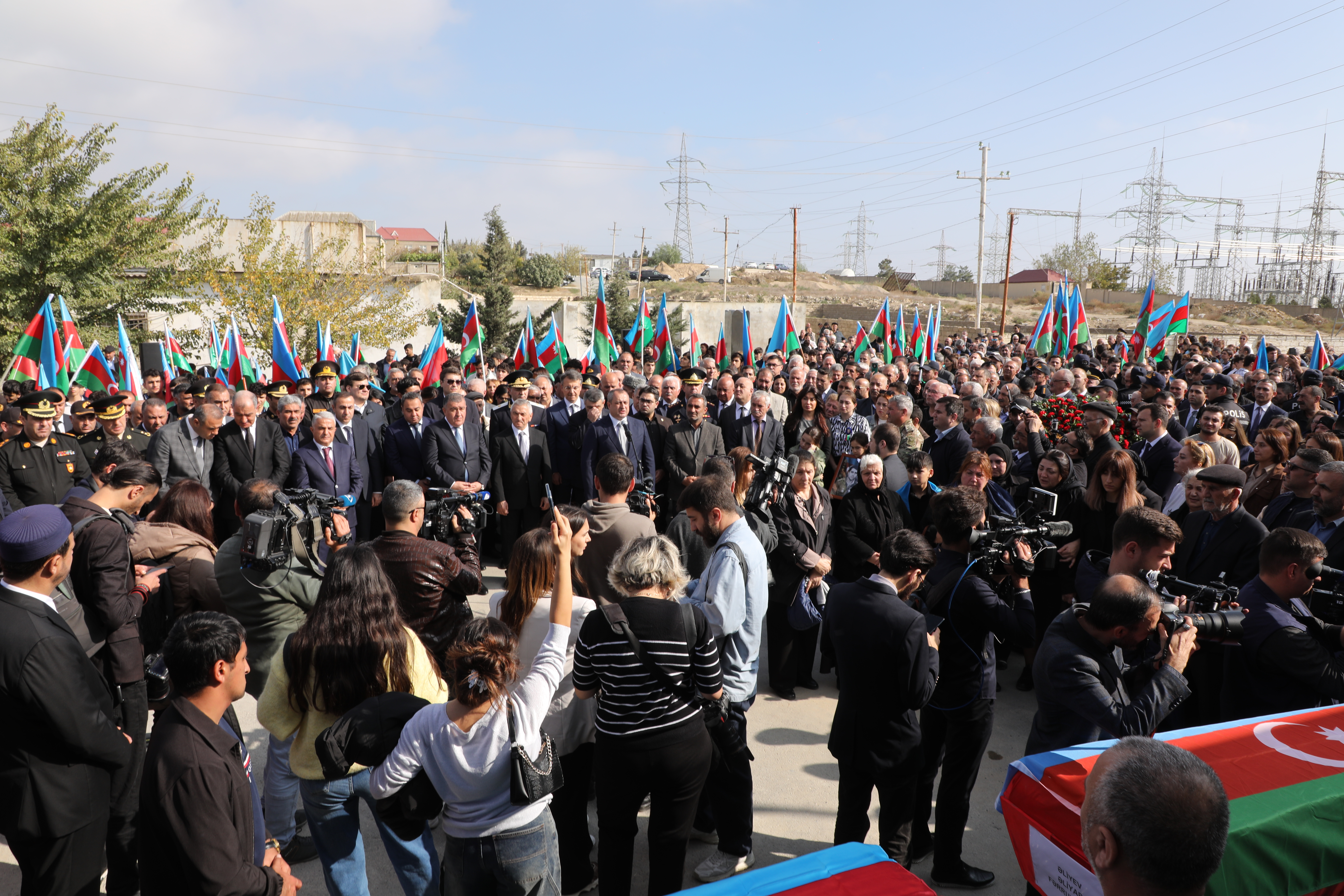 Tabutların büküldüyü Azərbaycanın Dövlət Bayraqları şəhidlərin yaxınlarına təqdim olunub.