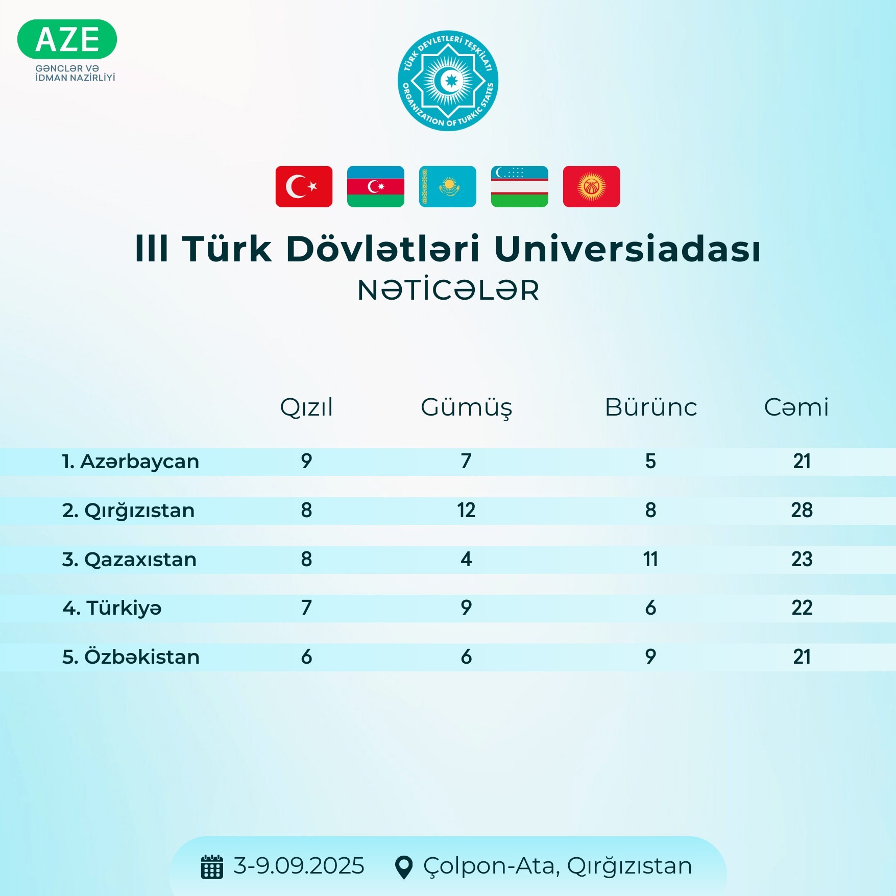 Qırğızıstanın İssık-Kul vilayətinin Çolpon-Ata şəhərində keçirilən III Türk Dövlətləri Universiadasında Azərbaycan ümumi nəticələrə görə ölkələr arasında birinci olub.