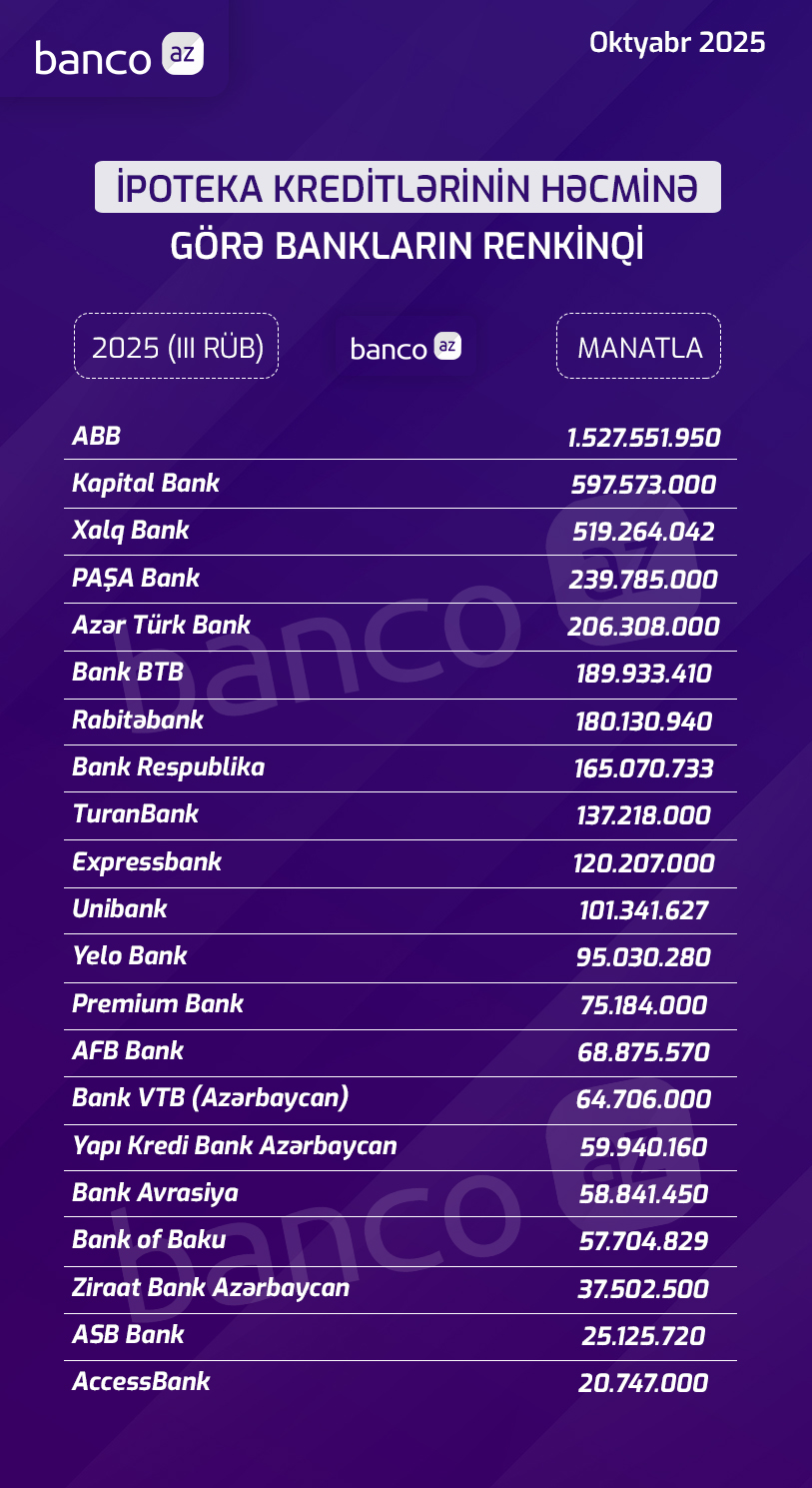 İpoteka kreditlərinin həcminə görə bankların renkinqi (III rüb, 2025)