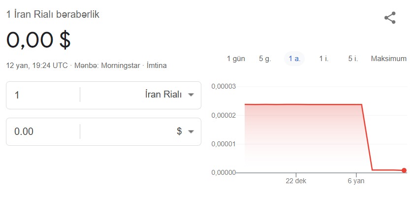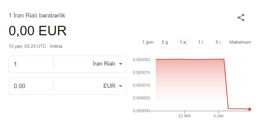“Qafqazinfo” xəbər verir ki, ölkənin milli valyutası rial avro və dollara qarşı faktiki olaraq “0,00” səviyyəsinə enib.