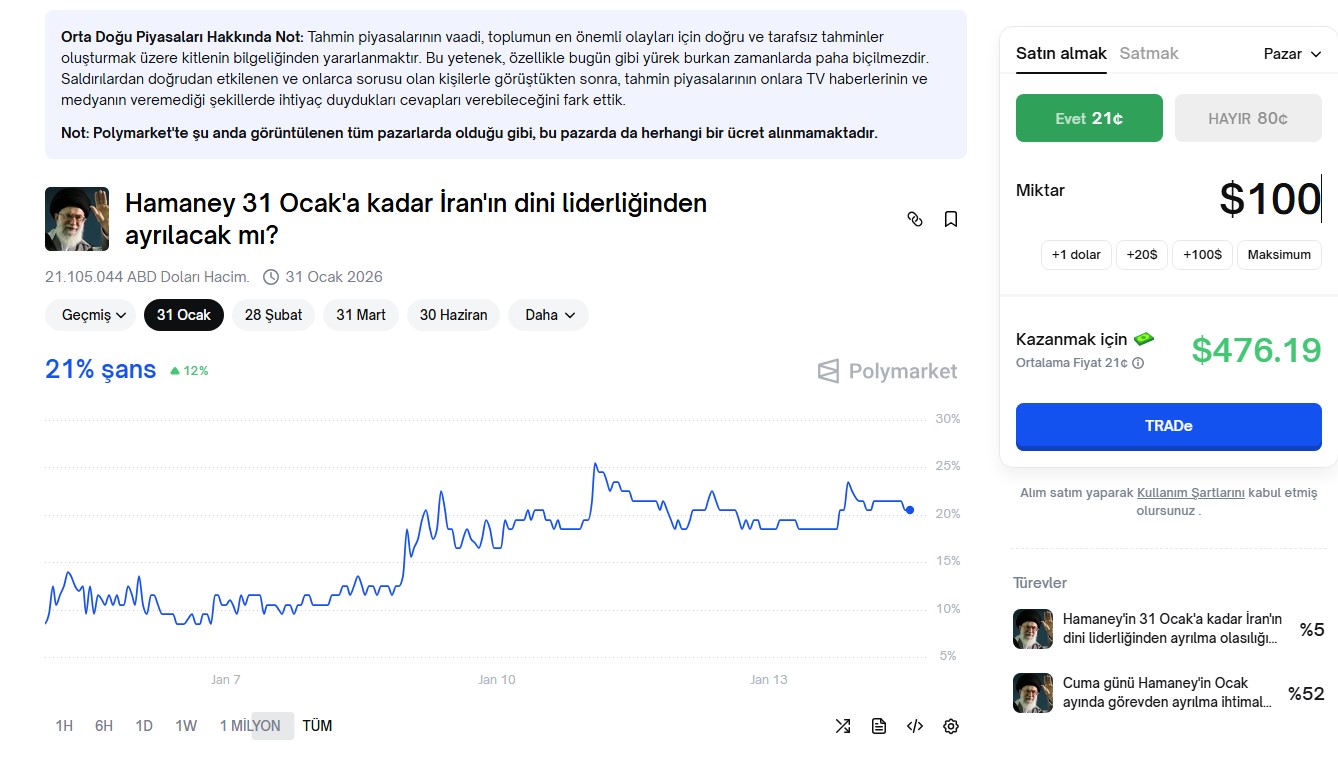 Bukmeker kontorunun təqdim etdiyi əmsallara görə, Xameneinin 31 yanvara qədər İranı tərk etməsi ehtimalına 4.76 əmsal müəyyən edilib. Bu o deməkdir ki, bu ssenariyə 100 dollar mərc edən şəxs baş verəcəyi təqdirdə 476 dollar qazanc əldə edə bilər.