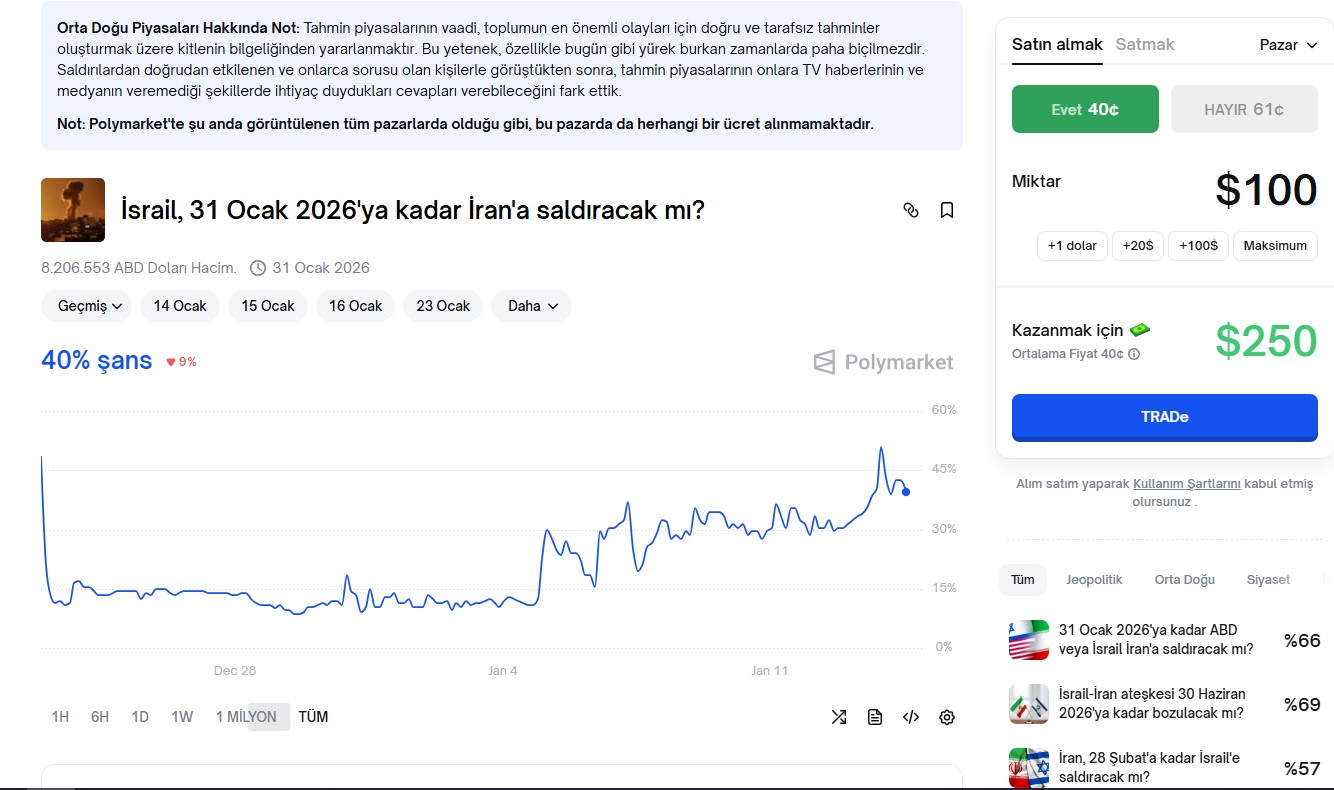 Eyni zamanda, İsrailin 31 yanvara qədər İrana hücum edəcəyi ehtimalına 2.43 əmsal verilib. Bu da mərc bazarlarında hərbi eskalasiya riskinin kifayət qədər yüksək qiymətləndirildiyini göstərir.