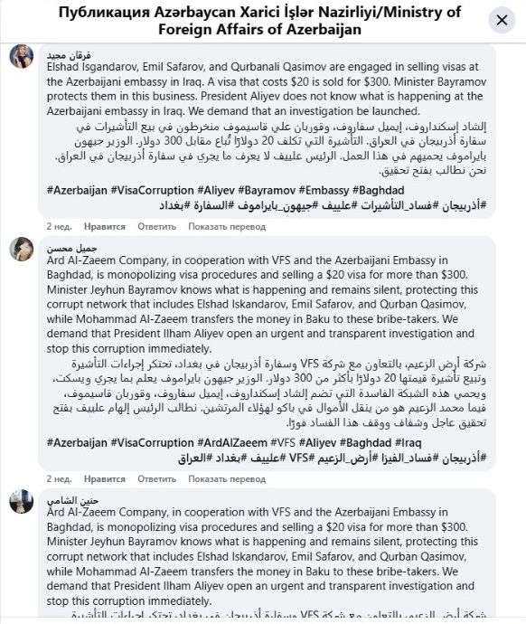 Artıq vəziyyət o həddə çatıb ki, əvvələr sosial şəbəkələrdə şikayətlənən İraq vətəndaşları, iş adamları artıq Azərbaycanın dövlət qurumlarına, xaricə səfər edən rəsmi şəxslərə səfirliyimizin fəaliyyəti, viza və pasport alveri, süründürməçilik, bu sahədə monopoliya yaradılması, rüşvət tələb edilməsi ilə bağlı şikayət edirlər. Azərbaycana sərmayə yatırmaq istəyən İraq şirkətləri də bu vəziyyətdən narazıdırlar.