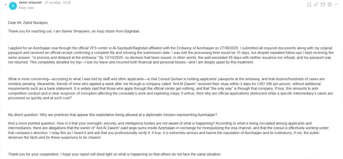 İraqın sadə vətəndaşları da səfirliyin yaratdığı "viza monopoliyası"ndan əziyyət çəkirlər. Onlardan biri də Samer Faisal Abdulsaheb Smaysemdir. O, viza üçün müraciət etdiyi Azərbaycan səfirliyinin davranışından çox narazı qalıb.