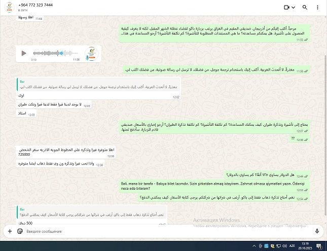 Yuxarıda qeyd olunan şikayətlərlə bağlı Azərbaycan şəfirliyi ilə şərikli biznes qurmaqda adı hallanan “Əl-Zaeem” şirkəti ilə sosial şəbəkə üzərindən əlaqə saxladıq. Yaxın dostumuzun Azərbaycana səyahət etmək istədiyini bildirdik və viza məsələsində yardım istədik. Şirkətdən heç bir problem olmadığını, 500 ABŞ dolları qarşılığında viza və təyyarə bileti təşkil edə biləcəklərini söylədilər.