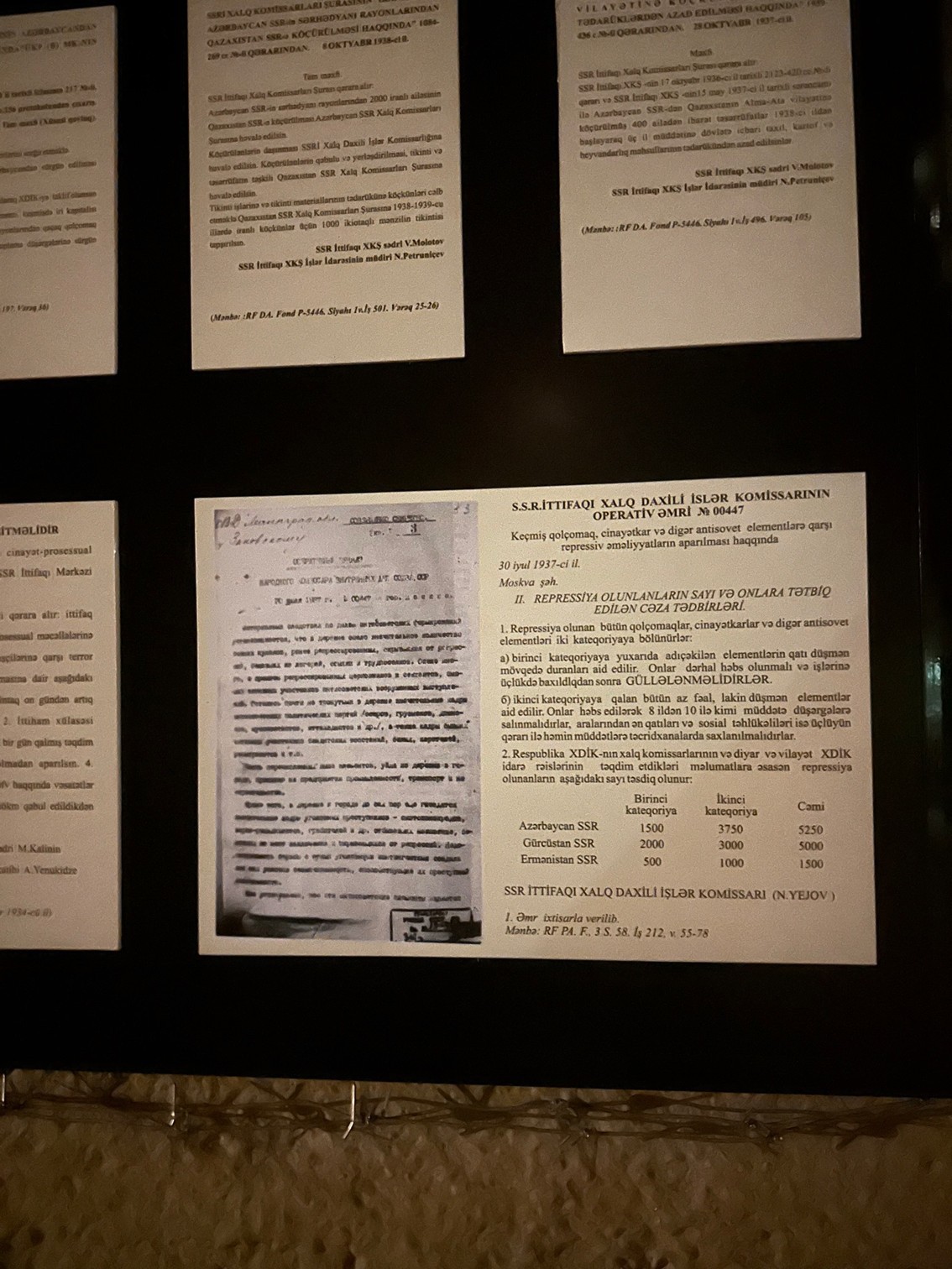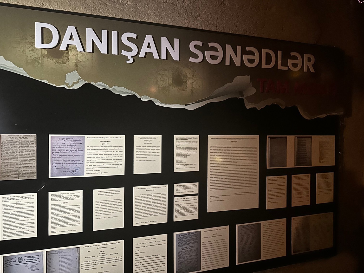 Muzeyin əsas zalında “Danışan sənədlər” adlanan lövhədə repressiyanın həyata keçirilməsi ilə bağlı 1920-1930-cu illərdə qəbul edilmiş 20-yə yaxın sənədin surəti sərgilənir.