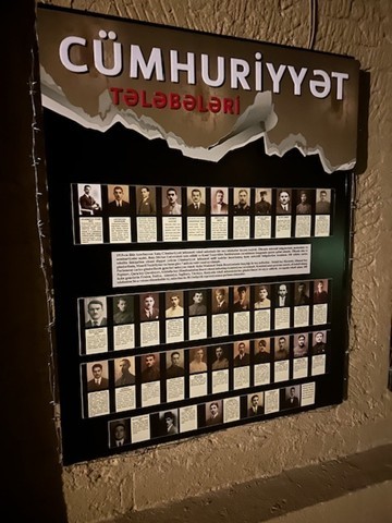 Digər bir lövhədə Azərbaycan Xalq Cümhuriyyəti tərəfindən 1920-ci ilin yanvarında təhsil almaq üçün Avropaya göndərilən gənclərin təhsillərini başa vurub Vətənə qayıdandan sonra məruz qaldıqları təqiblərə həsr edilib. Vətənə dönmüş 56 ali təhsilli mütəxəssislərdən güllələnib və sürgün edilmiş 38 gənc barədə məlumatlar, onların şəkilləri və qısa tərcümeyi-halları burada yer alıb.