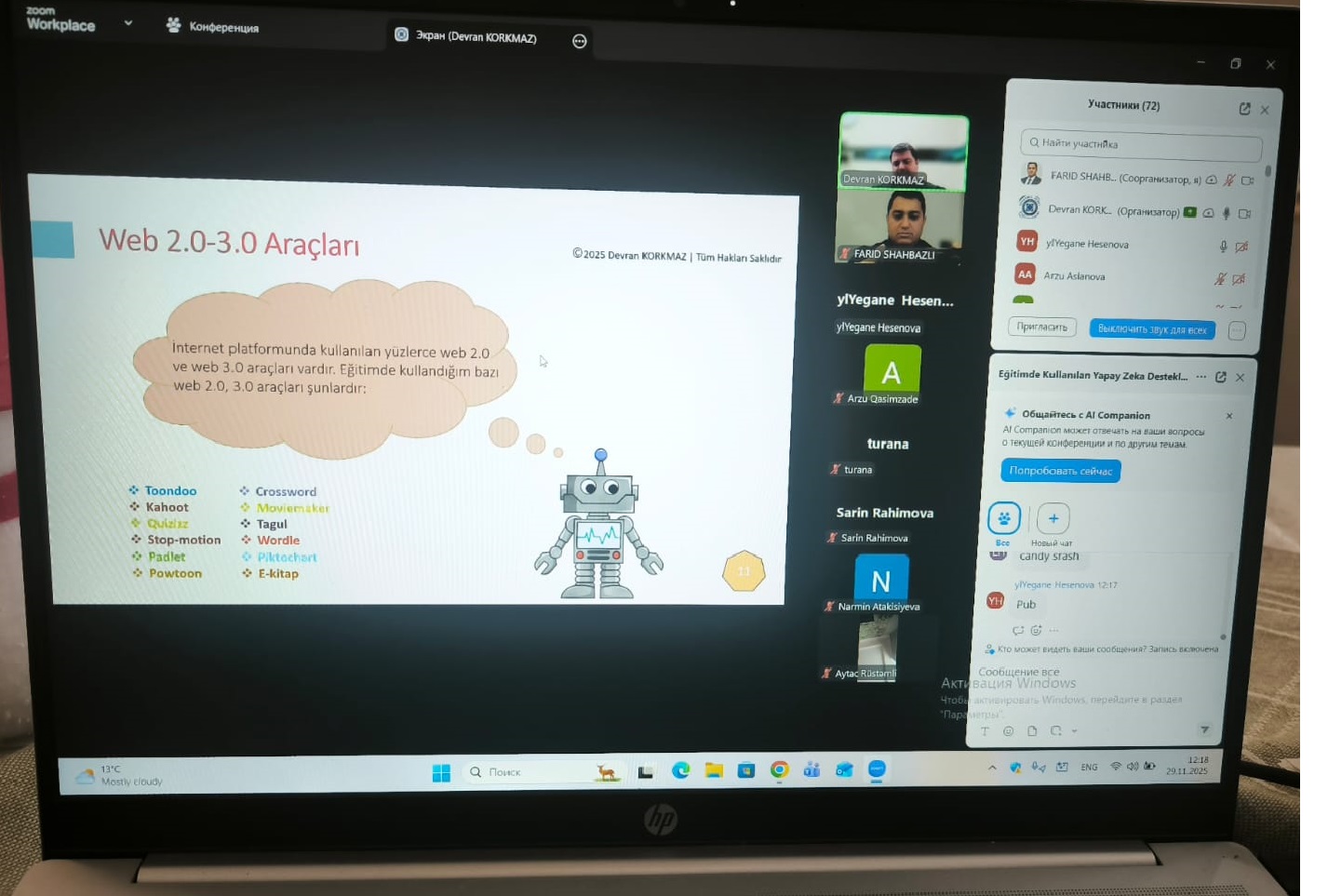 Təlimlər “Təhsil psixologiyası və şagird motivasiyası”, “Təhsil prosesində qiymətləndirmənin yeni yanaşmaları”, “Effektiv dərs planlaşdırılması və vaxtın idarə edilməsi”, “Təhsildə tətbiq olunan süni intellekt dəstəkli texnoloji materiallar” mövzularını əhatə edib. Sessiyalar İstanbul Aydın Universitetinin təcrübəli müəllimləri — Vildan Saruhan, Sözer Kırca, Buket Karadağ və Devran Korkmaz tərəfindən aparılıb.