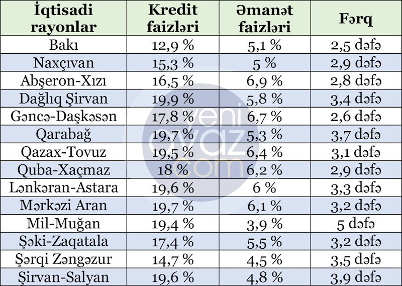 Məlumatlar göstərir ki, bütün iqtisadi rayonlarda kredit faizləri əmanət faizlərini dəfələrlə üstələyir. Kredit və əmanət faizləri arasındakı ən böyük fərq Mil-Muğan iqtisadi rayonunda qeydə alınıb – burada kredit faizləri əmanət faizlərini 5 dəfə üstələyir.