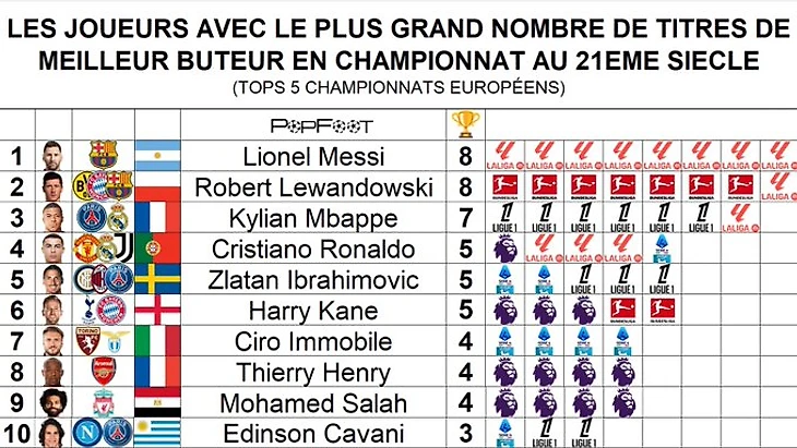 Lent.az bildirir ki, Lionel Messi və Robert Levandovski hər biri 8 belə mövsümlə siyahıya başçılıq edirlər. Messi "Barselona" ilə 8 dəfə La Liqanın bombardiri olub. O, hazırda MLS-də qol vurmaq yarışına rəhbərlik edir (16 qol), lakin Sem Surric arxasınca gəlir.