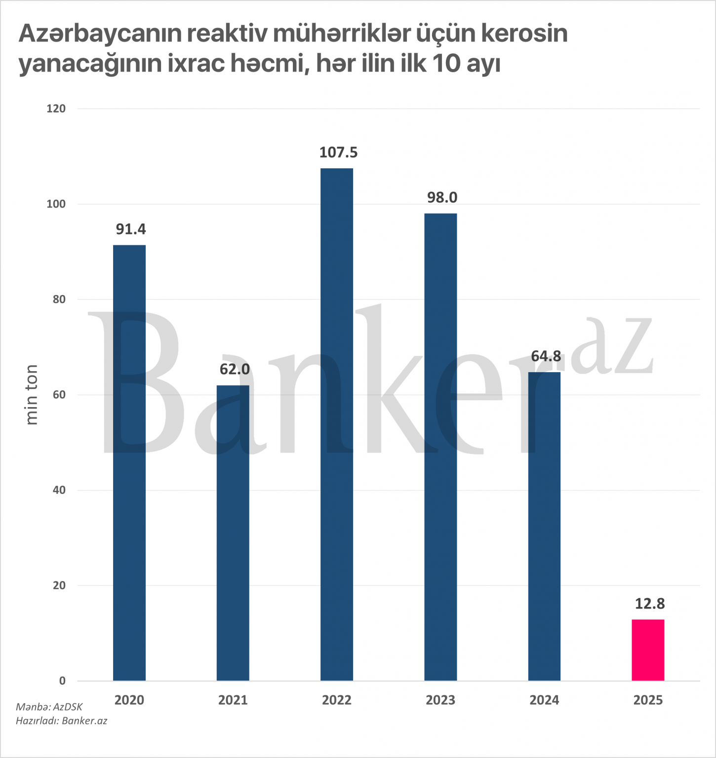 Bu il Azərbaycanın reaktiv mühərriklər üçün kerosin yanacağının əsas müştəriləri alışları kəskin azaldıblar və son illərin minimum həddinə düşüb. Əsas alıcısı Lüksemburq siyahıda da nəzərəçarpacaq fərqlə idxalı endirib. Avtosfer.az "Banker.az"a istinadən xəbər verir ki, 2024-cü ildə 64.761 min ton və 67.877 mln. dollar həcmində olan ixrac, 2025-ci ildə 12.848 min ton və 12.723 mln. dollara geriləyib. Bu, tonla təxminən 80%, dəyərlə ifadədə isə 81% azalma deməkdir.