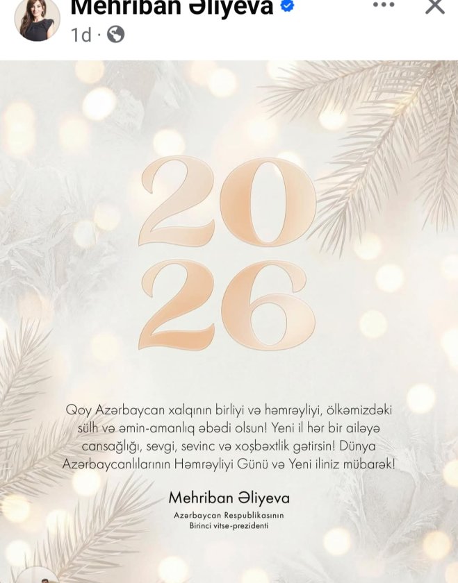 Bu mövzuda digər xəbərlər:Azərbaycanın Birinci vitseprezidenti Mehriban Əliyeva Dünya Həmrəyliyi Günü və Yeni il münasibətilə paylaşım edib