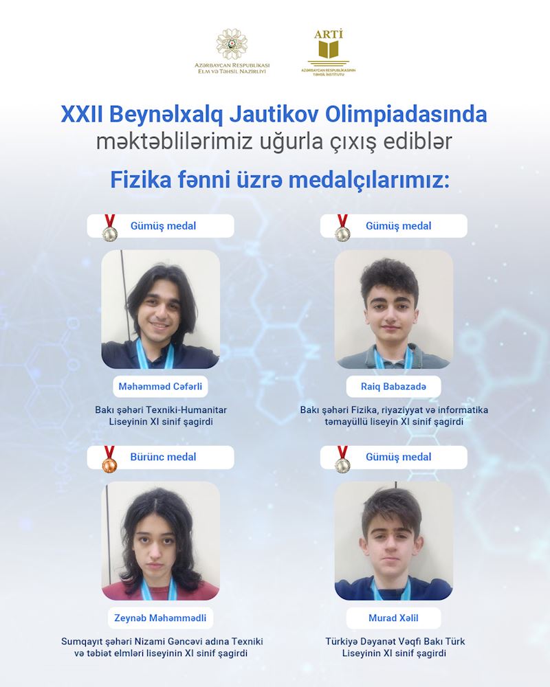 Belə ki, fizika fənni üzrə Bakı şəhəri Texniki-Humanitar Liseyinin XI sinif şagirdi Məhəmməd Cəfərli, Bakı şəhəri Fizika, riyaziyyat və informatika təmayüllü liseyin XI sinif şagirdi Raiq Babazadə və Türkiyə Dəyanət Vəqfi Bakı Türk Liseyinin XI sinif şagirdi Murad Xəlil gümüş medala, Sumqayıt şəhəri Nizami Gəncəvi adına Texniki və təbiət elmləri liseyinin XI sinif şagirdi Zeynəb Məmmədli isə bürünc medala layiq görülüblər.
