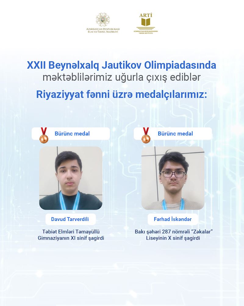 Riyaziyyat fənni üzrə Təbiət Elmləri Təmayüllü Gimnaziyanın XI sinif şagirdi Davud Tarverdili və Bakı şəhəri 287 nömrəli “Zəkalar” Liseyinin X sinif şagirdi Fərhad İskəndər bürünc medala layiq görülüblər.