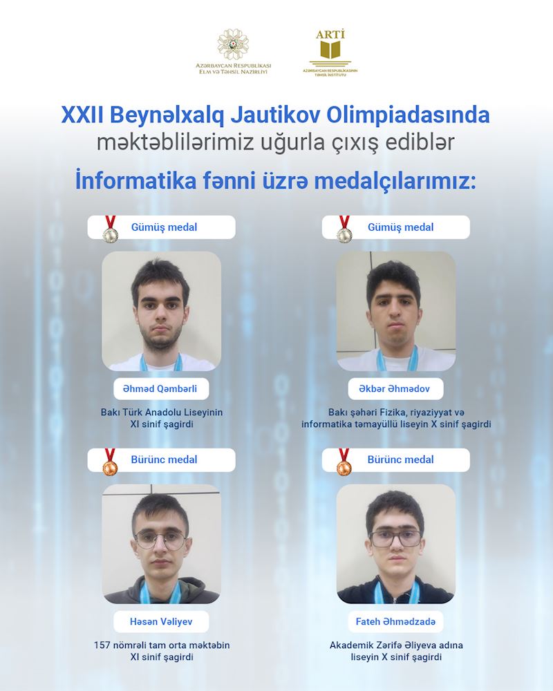 İnformatika fənni üzrə Bakı Türk Anadolu Liseyinin XI sinif şagirdi Əhməd Qəmbərli və Bakı şəhəri Fizika, riyaziyyat və informatika təmayüllü liseyin X sinif şagirdi Əkbər Əhmədov gümüş medala, 157 nömrəli tam orta məktəbin XI sinif şagirdi Həsən Vəliyev və Akademik Zərifə Əliyeva adına liseyin X sinif şagirdi Fateh Əhmədzadə bürünc medala layiq görülüblər.