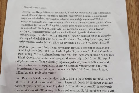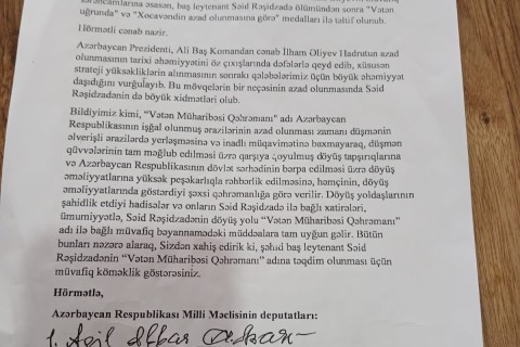 ...Milli Məclisin 26 deputatı Müzəffər Ali Baş Komandan İlham Əliyevə Səid Rəşidzadəyə "Vətən Müharibəsi Qəhrəmanı" fəxri adının verilməsi ilə bağlı müraciət edib. Bu, qəhrəman azərbaycanlı Səid Rəşidzadənin haqqıdı, ruhunu şad edəcək məqamdı...