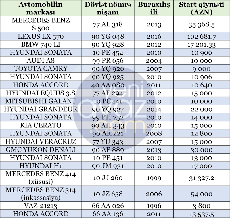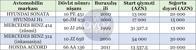 Hərraca çıxarılan avtomobillərin siyahısını təqdim edirik: