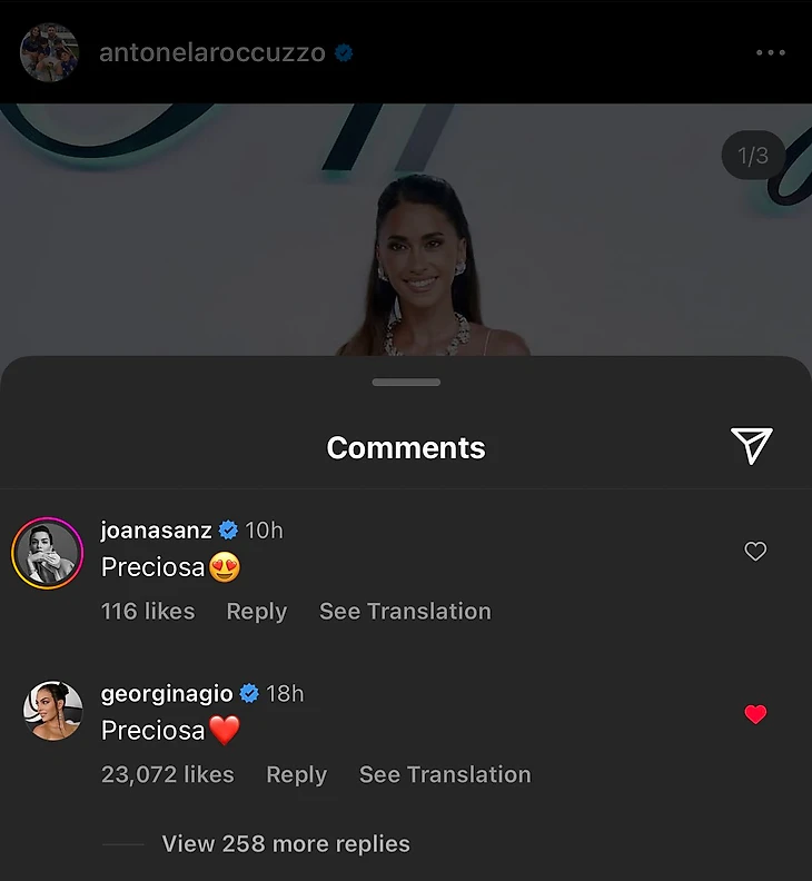 Antonella bu yaxınlarda ağ paltarda fotosunu yayımlayıb. Corcina şərh bölümündə görünüb və emoji əlavə edərək “Gözəl” yazıb. Bir az sonra Ronaldonun sevgilisi də Venesiya Film Festivalında qırmızı paltarda poza verdiyi fotonu yayımlayıb və bu dəfə Antonella biganə qalmayıb.